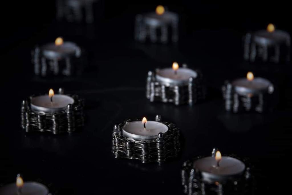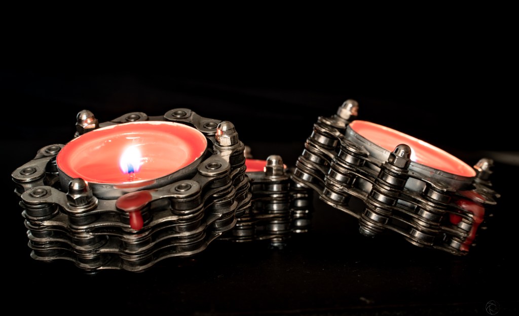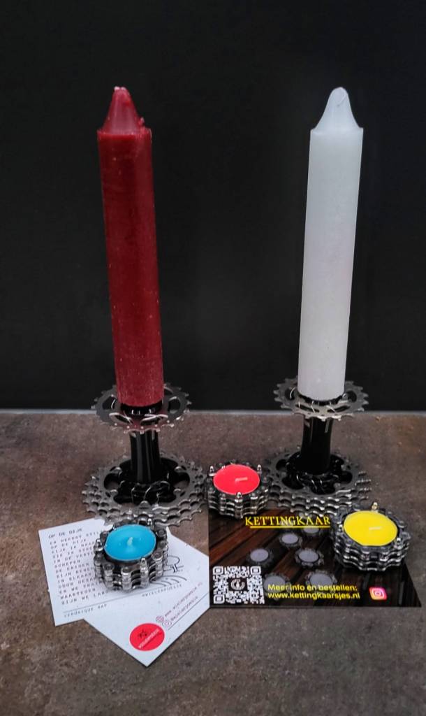 Theelichthouders gemaakt van oude racefietskettingen. Koop jouw unieke kaarsenhouder voor het goede doel hier.
